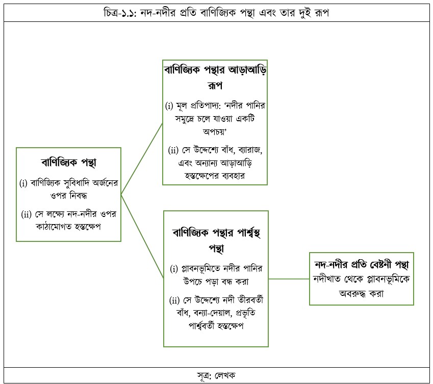 উল্লিখিত দুই ধরনের হস্তক্ষেপের আলোকে নদ-নদীর প্রতি বাণিজ্যিক পন্থাও দুটি ভিন্ন রূপ গ্রহণ করে (চিত্র-১.১)। একটি হলো আড়াআড়ি রূপ এবং অন্যটি হলো পার্শ্বস্থ রূপ। বাণিজ্যিক পন্থার পার্শ্বস্থ রূপকে ‘বেষ্টনী পন্থা’ (কর্ডন অ্যাপ্রোচ) হিসেবে আখ্যায়িত করা হয়। কারণ, এসব পার্শ্বস্থ হস্তক্ষেপের মূল উদ্দেশ্য হলো প্লাবন এবং জোয়ারভূমিকে নদীখাত থেকে অবরুদ্ধ (কর্ডন) করে ফেলা, যাতে বর্ষাকালে নদ-নদীর পানি তাতে উপচে পড়তে না পারে। মনে করা হয় যে, এর ফলে প্লাবনভূমির বাণিজ্যিক মূল্য বৃদ্ধি পাবে। কারণ, এসব ভূমিতে অধিক ফসল ফলানো যাবে এবং বিভিন্ন ব্যয়বহুল অবকাঠামো নির্মাণ করা যাবে। এই প্রবন্ধে বাণিজ্যিক পন্থা কথাটি দুই অর্থে ব্যবহৃত হবে। একটি হলো বৃহত্তর অর্থে, যার দ্বারা এর আড়াআড়ি এবং পার্শ্বস্থ, উভয় রূপকেই বোঝানো হবে। দ্বিতীয় হলো সংকীর্ণ অর্থে, যার দ্বারা শুধু এর আড়াআড়ি রূপকে বোঝানো হবে। (ব্যবহারের সুনির্দিষ্ট আঙ্গিক থেকে বোঝা যাবে এটি কোন অর্থে ব্যবহৃত হয়েছে।) লক্ষণীয় যে, আড়াআড়ি হস্তক্ষেপ সাধারণত নদ-নদীর উজান এলাকায় বেশি দেখা যায়। কারণ, এসব এলাকায় নদ-নদী পাহাড়-পর্বতের মধ্যদিয়ে প্রবাহিত হয়; ফলে সেগুলোর ঢাল বেশি থাকে, যা বিদ্যুৎ উৎপাদনকে সুগম করে। পাহাড়-পর্বতের কারণে সেখানে আড়াআড়ি হস্তক্ষেপের মাধ্যমে জলাধার নির্মাণও সহজ হয়। পক্ষান্তরে, নদ-নদীর মধ্য এবং ভাটি অঞ্চলে পার্শ্বস্থ হস্তক্ষেপ বেশি দেখা যায়। কারণ, এসব স্থানে নদী প্লাবন এবং জোয়ারভূমির মধ্যদিয়ে অগ্রসর হয় এবং তাতে নদীর পানি উপচানো ঠেকানোর জন্য এসব হস্তক্ষেপ ব্যবহৃত হয়।
