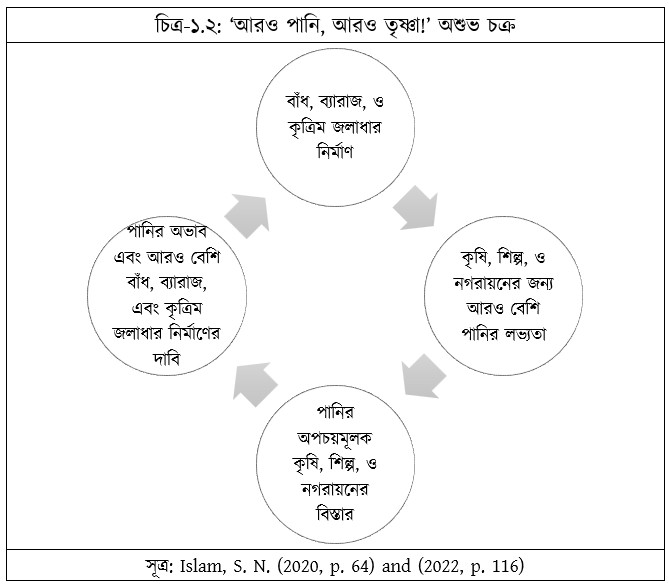 গবেষণা থেকে দেখা যায়, বাণিজ্যিক পন্থা অনুসারী হস্তক্ষেপের ফলে যেসব সুফল অর্জিত হয়েছে তা একইসঙ্গে অনেক কুফল বয়ে এনেছে। যেমন: বাঁধসৃষ্ট জলাধার থেকে প্রাপ্ত পানি অপচয়মূলক সেচের প্রসার ঘটিয়েছে; জলাবদ্ধতা এবং লবণাক্ততা সৃষ্টি করেছে; ফলে, জমির গুণাগুণ দীর্ঘ মেয়াদে ক্ষতিগ্রস্ত হয়েছে। অর্থনৈতিক বিচারে এসব সেচ দক্ষ হয়নি। বাঁধসৃষ্ট জলাধার থেকে সুলভে প্রাপ্ত পানি অনুপযোগী কৃষির প্রসার ঘটিয়েছে; অনুপযোগী স্থানে শহরের বিস্তার ঘটিয়েছে; পানির অপচয়মূলক জীবনধারাকে উৎসাহিত করেছে, এবং তার ফলে পানির চাহিদা বহুগুণ বৃদ্ধি করে পানির সংকট সৃষ্টি করেছে। এভাবে বাঁধ ‘আরও পানি, আরও তৃষ্ণা!’-রূপী অশুভ চক্রের জন্ম দিয়েছে (চিত্র-১.২)।