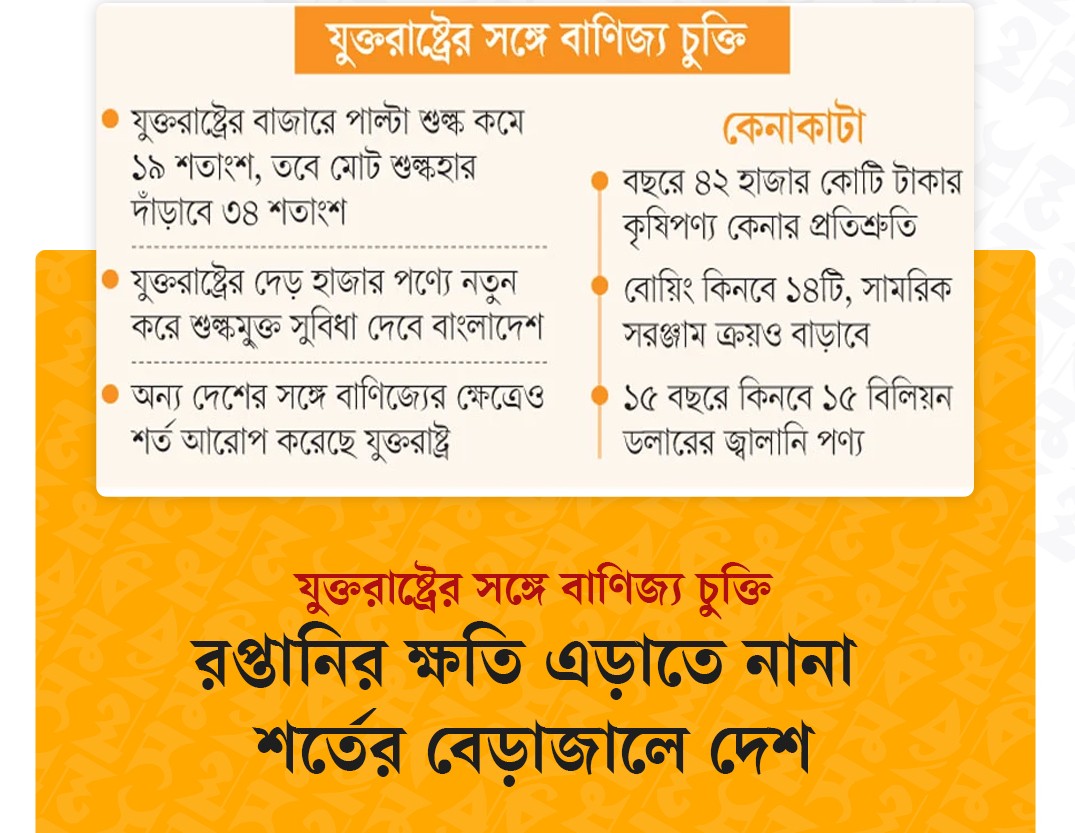 গত ৯ ফেব্রুয়ারি যুক্তরাষ্ট্রের সাথে স্বাক্ষরিত ‘বাণিজ্য’  চুক্তির মাধ্যমে বাংলাদেশের পণ্য রপ্তানির ক্ষেত্রে যুক্তরাষ্ট্রের আরোপিত রেসিপ্রোকাল ট্যারিফ বা পাল্টা শুল্কহার ১৯ শতাংশ ধার্য করা হয়। যুক্তরাষ্ট্রের বাজারে পণ্য প্রবেশে বিদ্যমান সাধারণ গড় শুল্কহার সাড়ে ১৫ শতাংশ। এর ওপর বাড়তি পাল্টা শুল্ক আরোপ হয় ১৯ শতাংশ। অর্থাৎ দেশটির বাজারে বাংলাদেশি পণ্যে মোট শুল্কের পরিমাণ দাঁড়ায় সাড়ে ৩৪ শতাংশ। (অনামা ২০২৬ক) যুক্তরাষ্ট্রের তুলা বা সুতা ব্যবহার করে তৈরি পোশাক রপ্তানির ক্ষেত্রে যে ‘পাল্টা শুল্ক’ অব্যাহতি পাবে বলে প্রচার করা হয়েছে, সেটাও নানা শর্তযুক্ত। এসব শর্ত মেনে বাংলাদেশ ঠিক কতটা সুবিধা আদায় করতে পারবে তা নিয়ে ব্যবসায়ীরাই প্রশ্ন তুলেছেন। (অনামা ২০২৬খ) অথচ বিনিময়ে বাংলাদেশকে যুক্তরাষ্ট্রের স্বার্থ রক্ষায় বাণিজ্য, অর্থনীতি ও ভূরাজনৈতিক ক্ষেত্রে নানান শর্ত মেনে চলার অঙ্গীকার করতে হয়েছে।